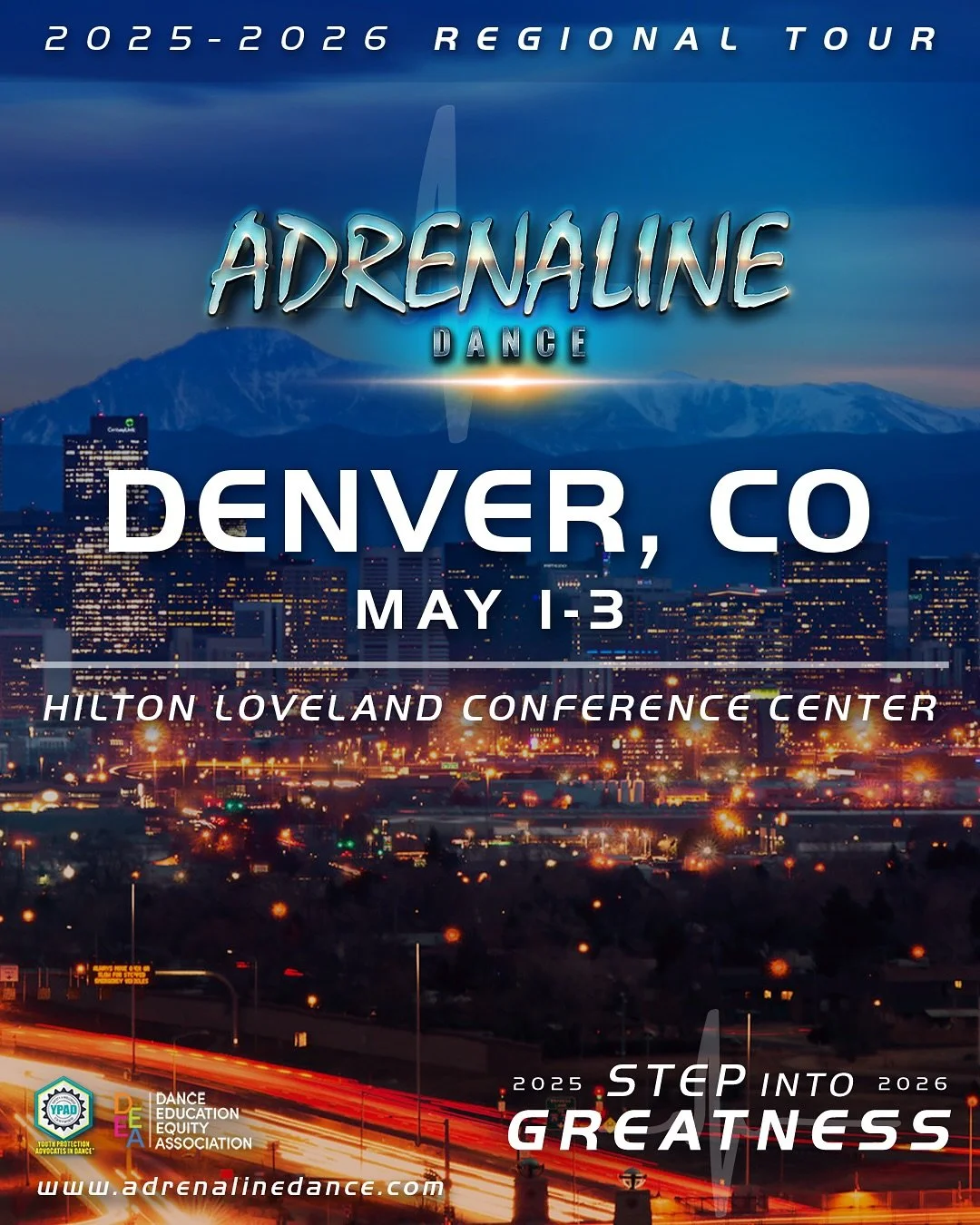 Adrenaline Dance is excited to be making 30 stops during our 2025-2026 North American Regional Tour! Our team’s shared mission is focused on building a safe space for creators, educators, and students to come together through the art of dance. We hope to impact the next generation by providing an inspiring, educational, and motivational milestone on their journey of growth. One that will continue to influence them for a lifetime. Join us at a city near you! We look forward to dancing together!